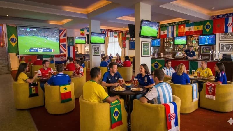 Indoor lobby bar with multiple screens for match viewing.